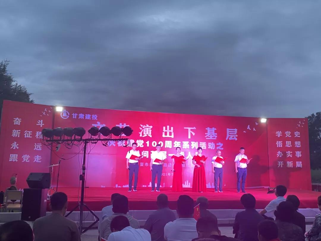 为喜迎中国共产党100周年华诞,响应文艺演出活动下基层政策。7月1日晚,由甘肃建投临夏市环城北路建设工程项目部组织,隧道公司四公司临夏市环城北路建设工程四区承办,庆祝中国共产党建党100周年系列活动之-——慰问基层一线人员文艺汇演活动在四工区项目施工现场隆重举行。