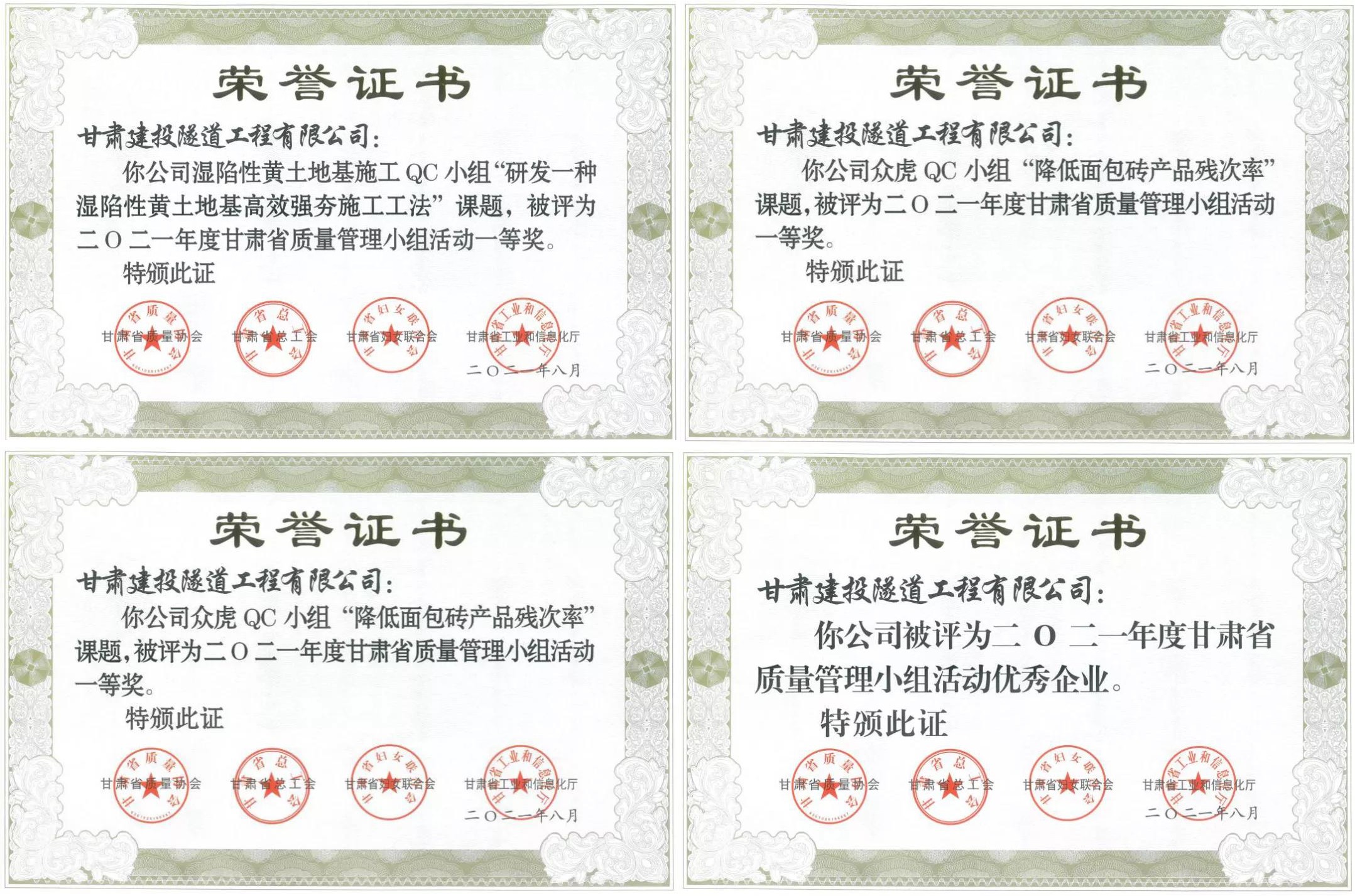 近日,从甘肃省质量协会传来喜讯,由隧道公司“湿陷性黄土地基施工QC小组“ “众虎QC小组” “装配式产业园道路项目QC小组”编写的《研发一种湿陷性黄土地基高效强夯施工工法》《降低面包砖产品残次率》《提高钢带增强聚乙烯波纹管闭水试验一次验收合格率》3项QC成果在甘肃省第41次质量管理小组活动年会暨成果交流会上获得省级一等奖的优异成绩。此外,隧道公司还被评为“2021年甘肃省质量管理小组活动优秀企业”。