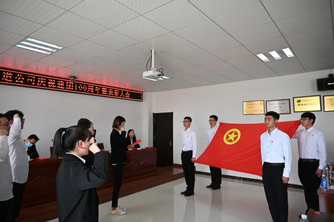 表彰会上,全体团员面对鲜红的团旗,高举右拳,重温入团誓词,重拾入团初心,坚定理想信念,牢记使命担当。
