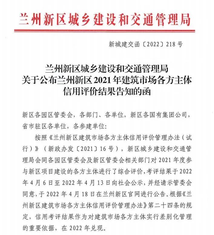近日,兰州新区城乡建设和交通管理局发布了《关于公布兰州新区2021年建筑市场各方主体信用评价结果告知的函》(新城建交〔2022〕218号),隧道公司获评兰州新区2021年建筑市场A级施工单位。
