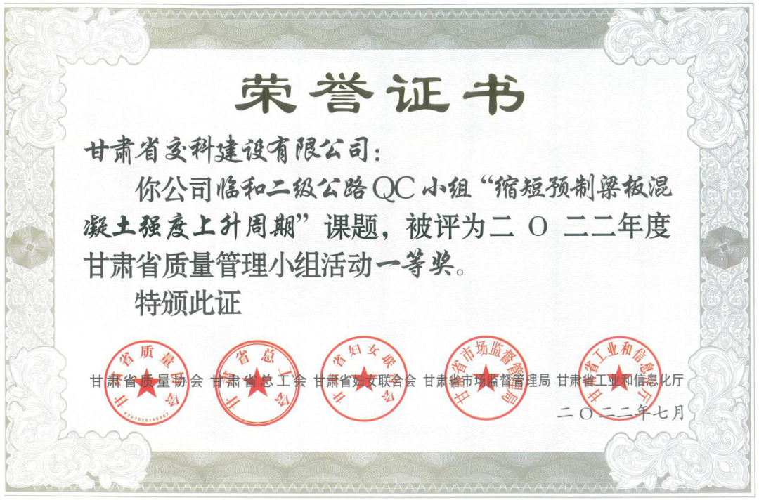 <p style="text-indent: 2em; text-align: left;">近日，从甘肃省质量协会传来喜讯，交科公司三公司两项QC成果《提高沥青混凝土路面平整度一次验收合格率》《缩短预制梁板混凝土强度上升周期》在甘肃省第四十二次质量管理小组活动成果交流会上斩获省级一等奖。交科公司一公司一项QC成果《提升房建项目混凝土柱外观一次合格率》荣获省级二等奖。此外，交科公司还被评为“2022年度甘肃省质量管理小组活动优秀企业”！</p><p style="text-align: center"><img src="../../hdupf/img/202210/202210121665557726374628.png" style="width: 386px; height: 298px;" width="386" height="298"/><img src="../../hdupf/img/202210/202210121665557726740962.png" width="387" height="280" style="width: 387px; height: 280px;"/></p><p style="text-align: center"><img src="../../hdupf/img/202210/202210121665557726553432.png" style="width: 360px; height: 261px;" width="360" height="261"/><img src="../../hdupf/img/202210/202210121665557726778698.png" width="351" height="230" style="width: 351px; height: 230px;"/></p><p style="text-indent: 2em;">截至目前，交科公司连续三年荣获“甘肃省质量管理小组活动优秀企业”荣誉称号，共拥有省级QC成果特等奖2项、一等奖18项、二等奖3项。</p><p style="text-indent: 2em; text-align: left;"><section>近年来，交科公司高度重视QC质量管理活动，建立健全管理QC工作机制及奖惩制度，不断加大QC小组活动组织力度，发挥广大职工智慧力量，解决项目施工中遇到的实际问题，取得了良好成效，为持续提升企业效益、科技创新水平奠定了坚实基础。</section></p><p><br style="text-indent: 2em; text-align: left;"/></p>			</div>