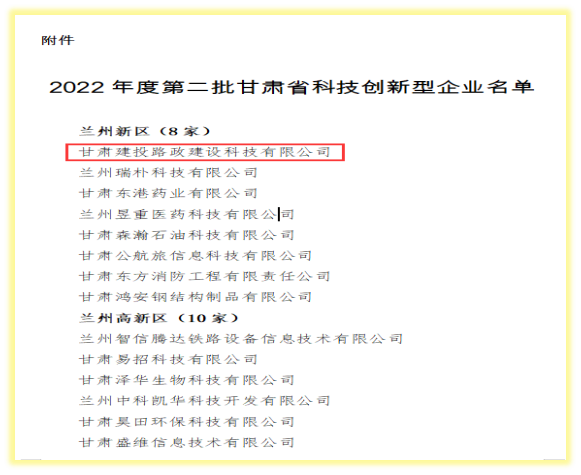 近日,2022年度第二批甘肃省科技创新型企业名单公布,甘肃建投路政建设科技有限公司被认定为“甘肃省科技创新型企业”。
