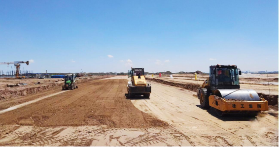 项目自进场以来,公司高度重视,积极主动谋划,选优配齐项目管理团队,建立安全质量管理体系,编制切实可行的管理策划,在确保安全、质量、成本前提下,提高工作效率,细化管理措施,确保实现业主确定的节点任务目标。截至目前,已完成原地面强夯163000㎡、路基土方回填93000m³、外弃土方367600m³、西侧场平土方311000m³、三七灰土填筑29000m³的工作量。
