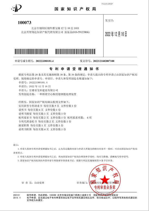<p style="text-indent: 2em; text-align: left;">&nbsp;近日，交科公司二公司申报的《一种桥梁横隔板安装吊篮机构》荣获国家知识产权局实用新型专利授权，《一种桥梁空心板绞缝钢筋处理装置》成功被国家知识产权局受理。</p><p style="text-align: center"><img src="../../hdupf/img/202302/202302231677141458327902.png" style="width: 487px; height: 344px;" width="487" height="344"/></p><p style="text-align: center"><img src="../../hdupf/img/202302/202302231677141458966394.png" style="width: 272px; height: 330px;" width="272" height="330"/></p><p style="text-indent: 2em; text-align: left;">据悉，应用该桥梁横隔板安装吊篮机构，可有效避免高空作业平台搭设难以及曲臂车无法适用的问题，能有效地降低项目成本投入及缩短施工周期。该桥梁空心板绞缝钢筋处理装置，属于建筑器具技术领域，本申请技术方案通过设置在横担上的支撑结构与下压结构，使装置斜向上45度N9钢筋扳至水平，进一步保证了施工质量。</p><p style="text-indent: 2em; text-align: left;">另外，二公司申报的省级工法《可监测大管径埋地HDPE管防渗施工工法》被评为2022年度省级优秀工法。该工法是针对管径大、管道埋设较深、排水量大、铺设点地质复杂（特别是西北区域湿陷性黄土地区）、管道接口施工质量难以保证、管道破损危害大且维修检测困难等问题提出来的，经一年多来的实践证明，本工法技术先进、安全适用，效益显著，值得向全社会推广应用，有良好的应用前景。</p><p style="text-indent: 2em; text-align: left;">新的一年即将来临，在下阶段的工作中，二公司将秉承脚踏实地、精益求精的工作态度，不断提升技术创新和成果转化能力，助力企业高质量发展！</p><p><br style="text-indent: 2em; text-align: left;"/></p>			</div>