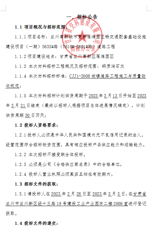 <h3>兰州高新城市更新雁滩园区畅交通配套基础设施建设项目（一期）S633#路（T610#-S601#路）道路工程材料招标公告</h3>