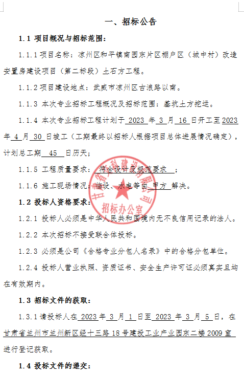 凉州区和平镇南园东片区棚户区(城中村)改造安置房建设项目(第二标段)土石方工程招标公告