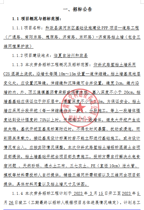 <h3>和政县滨河东区基础设施建设PPP项目—道路工程（广通路、南阳东路、槐荫路、济南路、东环路）-济南路挡土墙（包含三维网植草护坡）招标公告</h3>