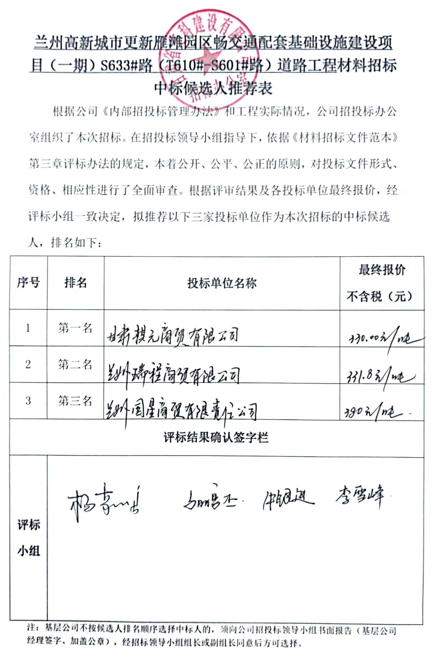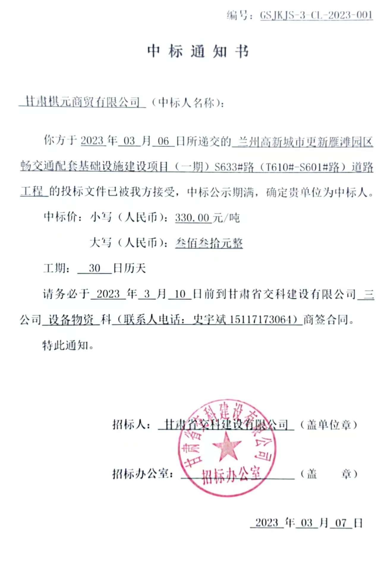 兰州高新城市更新雁滩园区畅交通配套基础设施建设项目(一期)S633#路(T610#-S601#路)道路工程中标候选人及中标通知书