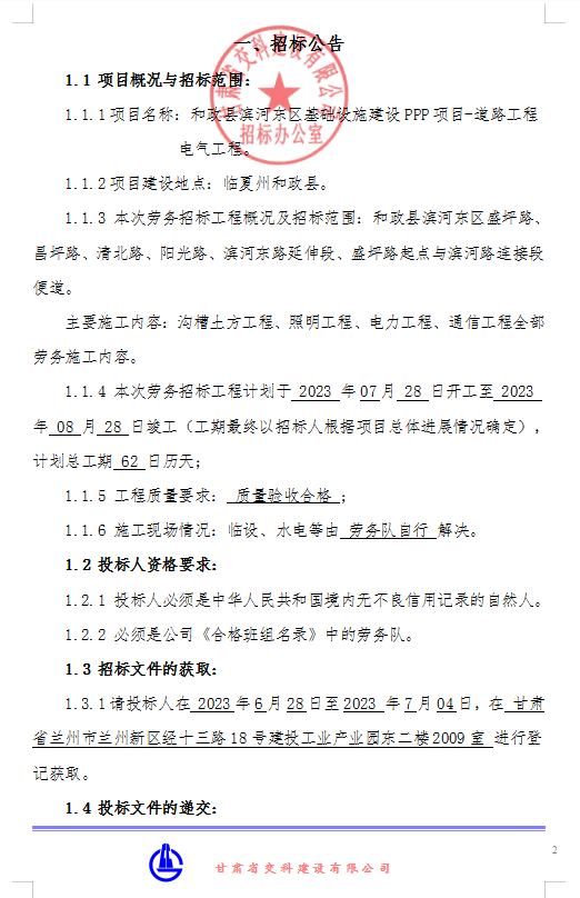 <h3>和政县滨河东区基础设施建设PPP项目-道路工程电气工程-招标公告</h3>