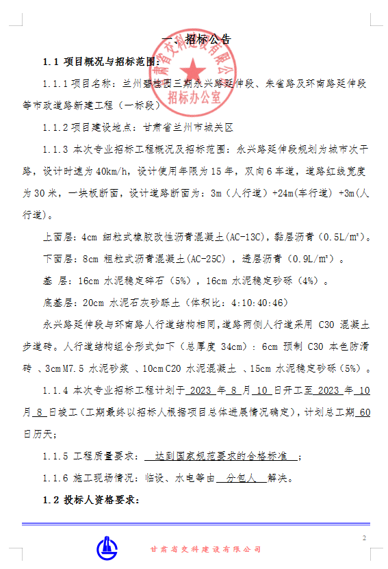 兰州碧桂园三期永兴路延伸段、朱雀路及环南路延伸段等市政道路新建工程(一标段)-专业分包招标公告