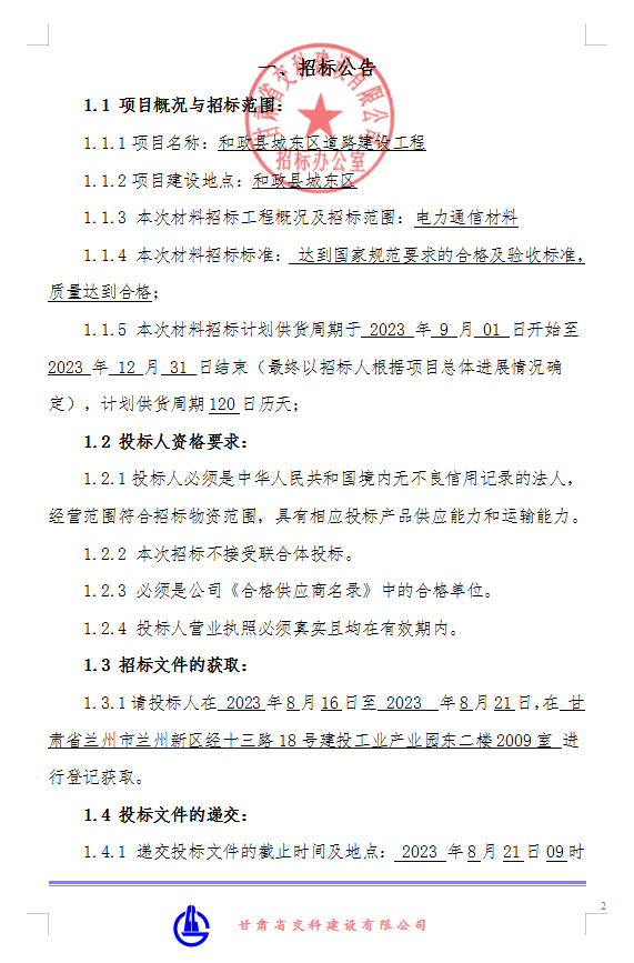 和政县城东区道路建设工程-电力通信材料-招标公告