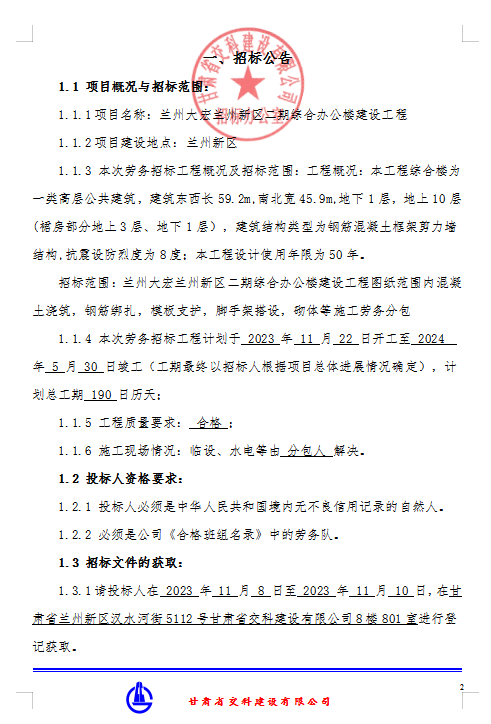 兰州大宏兰州新区二期综合办公楼 建设工程劳务分包-招标公告