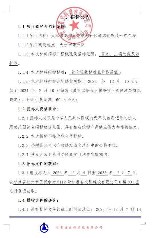 天水市秦州区建筑与社区海绵化改造一期工程项目材料招标公告