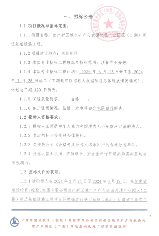 <h3>兰州新区城市矿产与表面处理产业园区（二期）周边基础设施工程顶管工程施工-专业分包招标公告</h3>