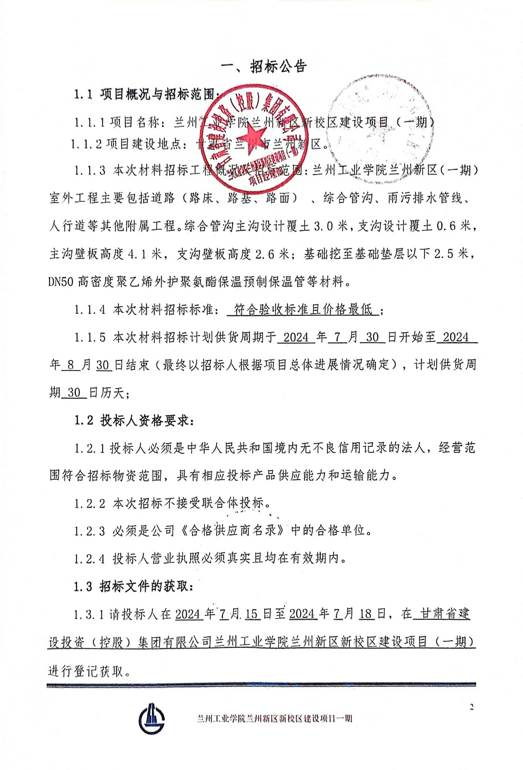 兰州新区工业学院兰州新区新校区建设项目(一期)-材料招标公告