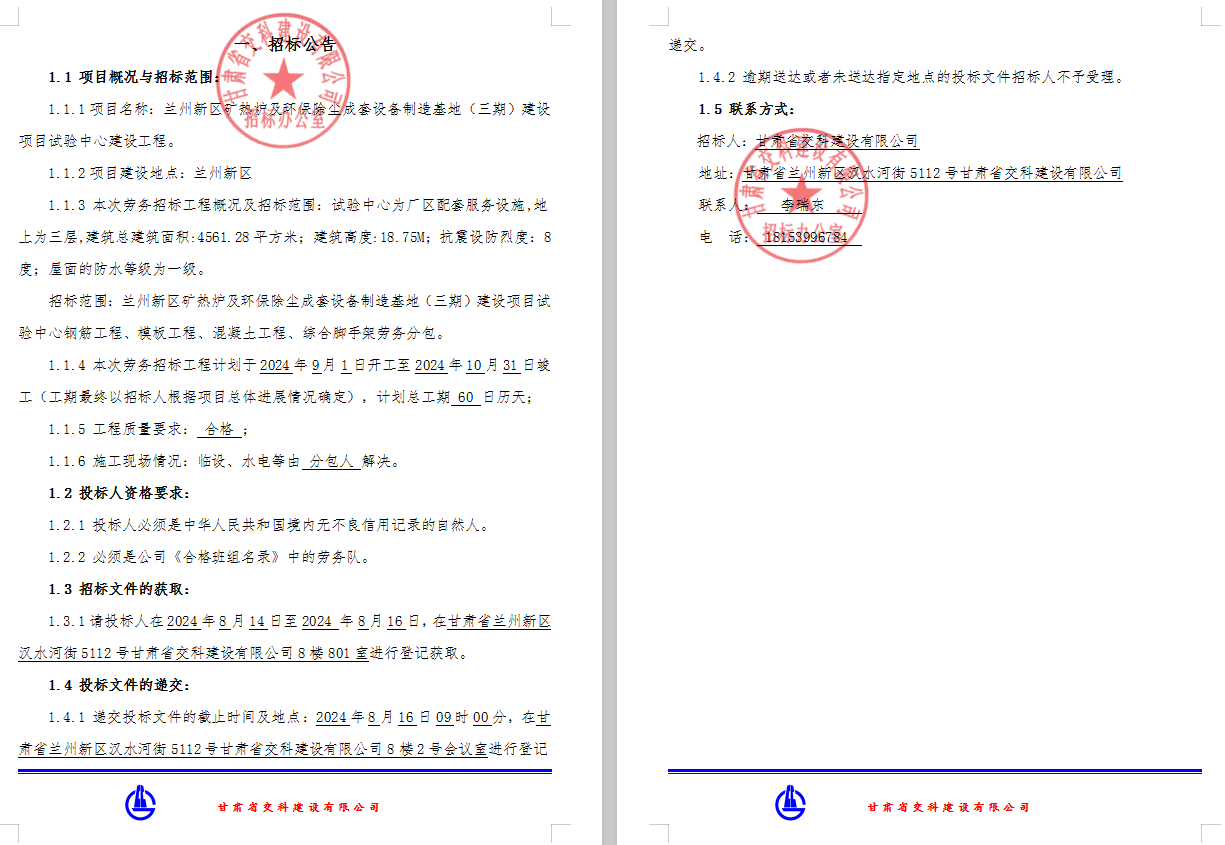 兰州新区矿热炉及环保除尘成套设备制造基地(三期)建设项目试验中心建设工程-钢筋、模板、混凝土、综合脚手架-招标公告