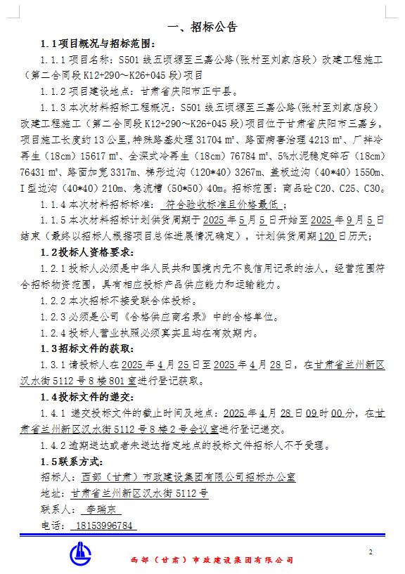 S501线五顷塬至三嘉公路(张村至刘家店段)改造工程施工(第二合同段K12+290-K26+045段)项目商品砼招标公告