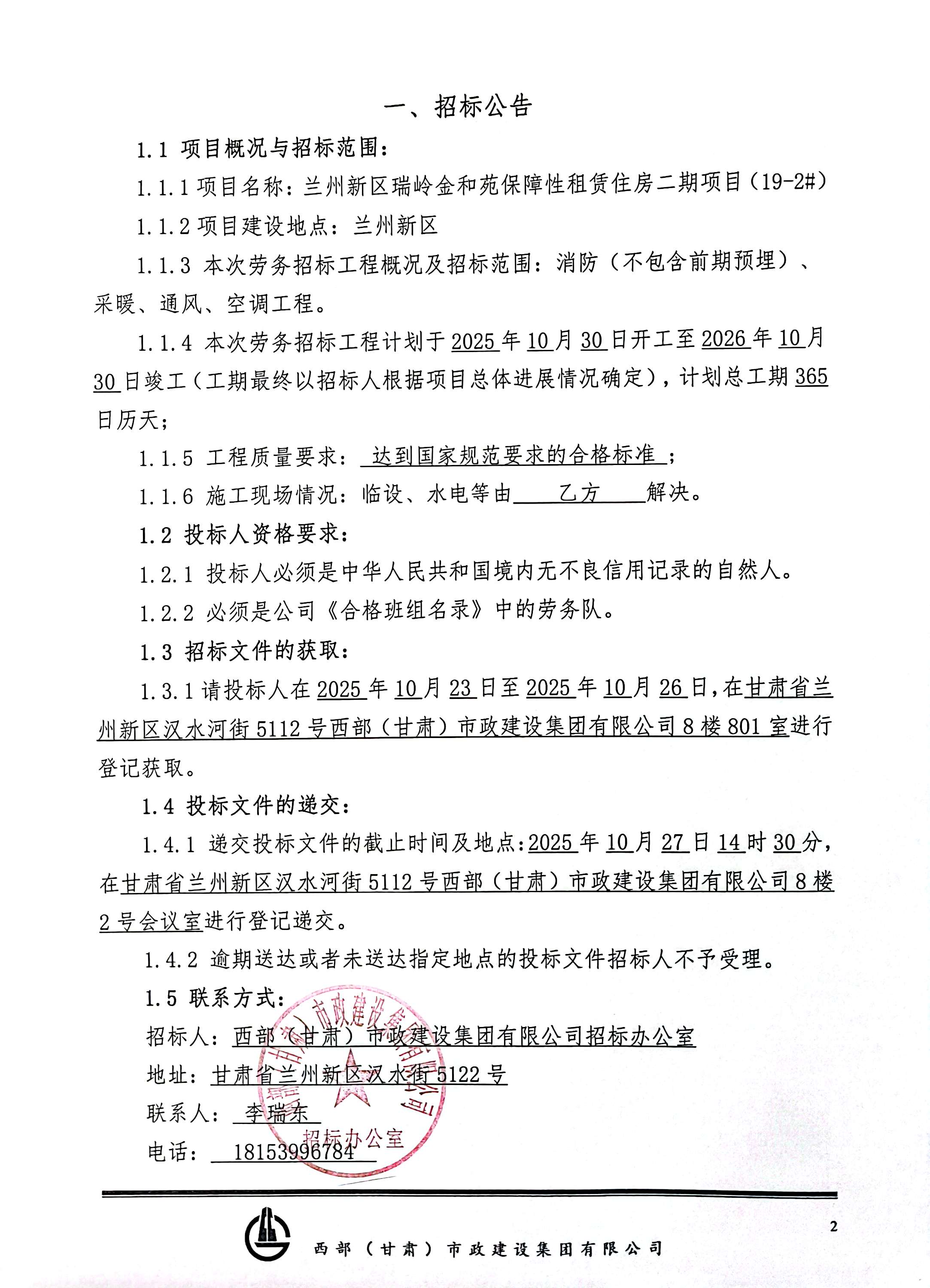 兰州新区瑞岭金和苑保障性租赁住房二期项目(19-2#)-消防(不包含前期预埋)、采暖、通风、空调工程-招标公告